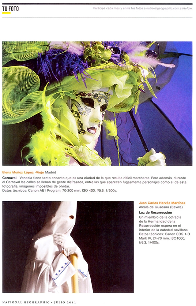 Siempre he sido seguidora de National Geographic, como tantos otros he conocido lugares fascinantes gracias a sus documentales o revistas, por lo que no dudé en participar en un concurso cuyo premio era la publicación de la fotografía ganadora en la revista National Geographic española. Y ¡Sorpresa! la foto fue ganadora de la temática «Fiestas y tradiciones»; cómo me costó rescatar y escanear ese negativo lleno de polvo que de milagro había sobrevivido a los rayones provocados por más de una mudanza.