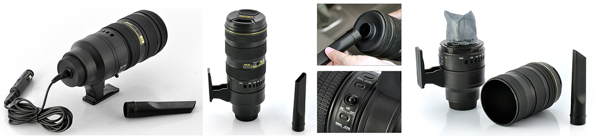 Su diseño imita el lente de una cámara réflex digital de marca muy conocida. Esta aspiradora se alimenta directamente a través del encendedor de tu coche o a través de un puerto USB (en el segundo caso, se observa una disminución de potencia). Limpia el interior de tu coche como todo un fotógrafo o regálalo a ese amigo que siempre lleva la cámara a cuestas.