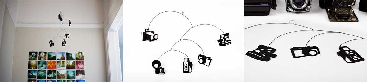 Para los más minimalistas hoy os muestro este pequeño objeto decorativo. Un móvil hecho a mano, compuesto por cinco ilustraciones referentes a los tipos de cámaras más famosas que se han utilizado. Una pequeña y ligera estructura en metal que puedes colgar donde quieras para decorar tu habitación.