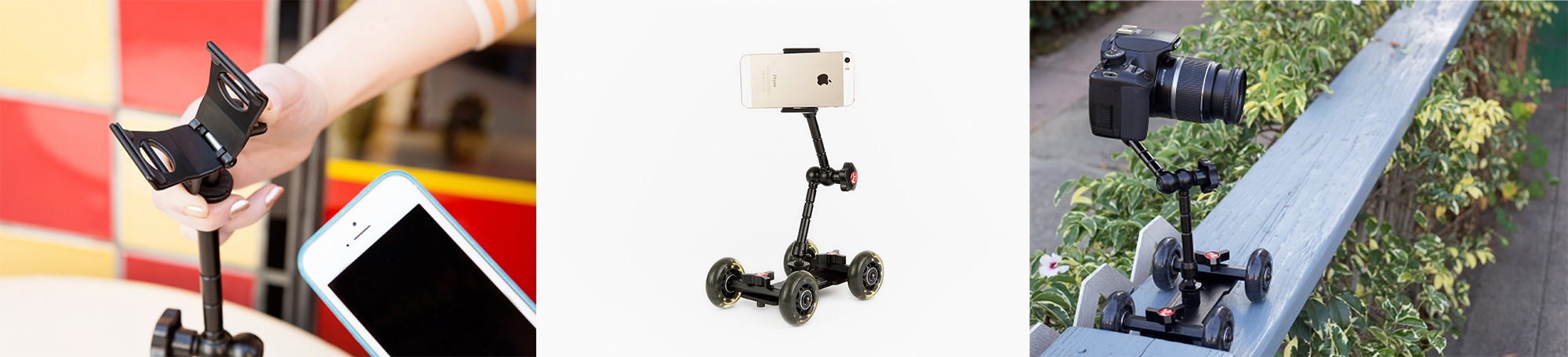 En esta ocasión os hablo de un pequeño soporte, para ayudaros a realizar vídeos con mayor estabilidad. Esto lo podéis lograr mediante el uso del carrito «Camera Table Dolly». Se basa en un sistema muy sencillo, con una base en aluminio un brazo articulado acabado en una pinza donde colocar el teléfono o cámara.